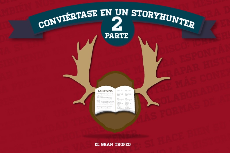 - Ponga su trofeo, al alcance de todos: tal vez le resulte familiar la imagen de la sala de un cazador, justo arriba de su poltrona, es usual encontrar exhibida la cabeza de aquel ejemplar que ha logrado capturar. De igual manera un storyhunter debe poner al alcance de su audiencia los medios para que sus historias sean conocidas por todos: un blog en wordpress, una app como Storehouse, un espacio en la intranet de su compañía, una invitación a tomar un café, o unas páginas en blanco; aquí lo importante es poner al alcance de los demás su relato y no simplemente llevar un registro del mismo.